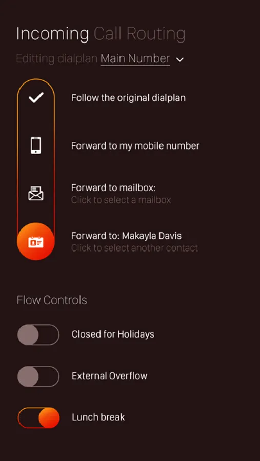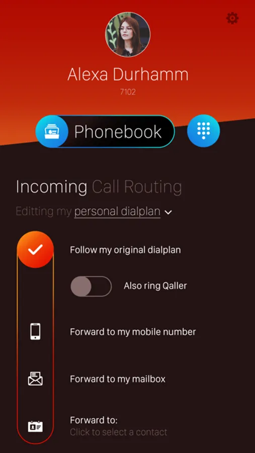 Qaller allows you to take charge of your Cloud PBX from your mobile phone. Quickly forward calls to your mobile phone when on the road or to a coworker when you're in a meeting. On a lunch break? Enable a flow control to make sure all calls will be taken care of.