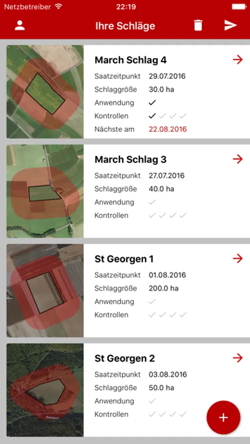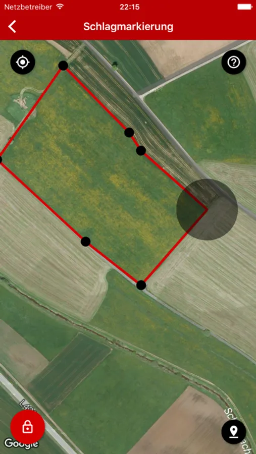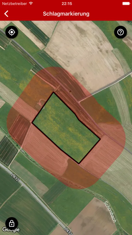 Sie zeigt Ihnen die Zone an, innerhalb Sie die Flächen nach Aufhellungen bei Nichtzielpflanzen rund um den Schlag kontrollieren müssen. Zur Dokumentation von Aufhellungen können Sie Fotos erstellen, die mit GPS-Koordinaten versehen werden. Für die Zuordnung der GPS-Koordinaten der aufgenommenen Fotos benötigt die App die Freigabe der Position in den Einstellungen.