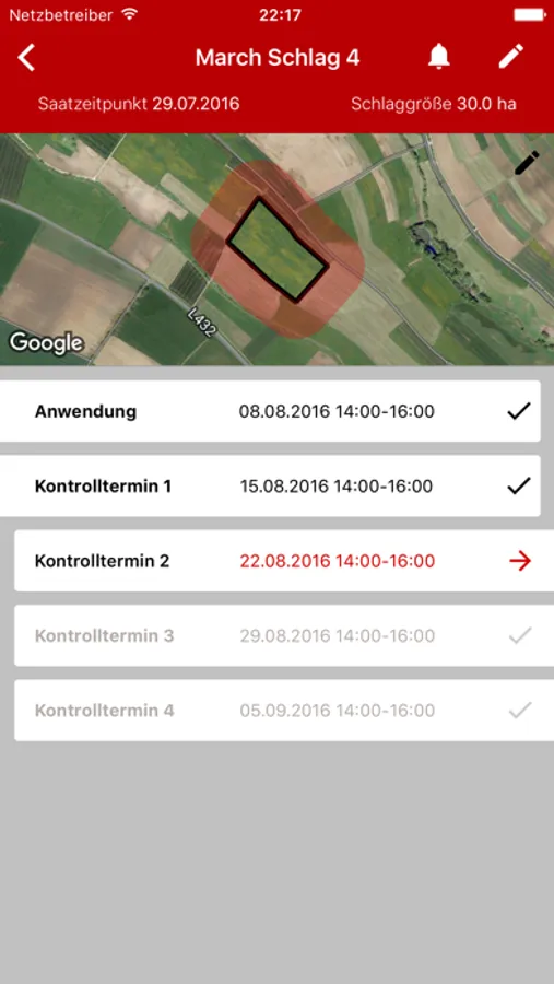 In der App markieren Sie Ihre Rapsanbauschläge einfach per Polygon und geben den Saattermin und den geplanten Spritztermin ein. Die App errechnet automatisch ihre Kontrolltermine, trägt sie in Ihren Kalender ein und erinnert Sie daran. Die Anwendung berücksichtigt die Clomazone-haltigen Produkte und deren Anwendung in Tankmischungen und die daraus resultierenden Kontrollzonen und Anwendungsvorschriften.