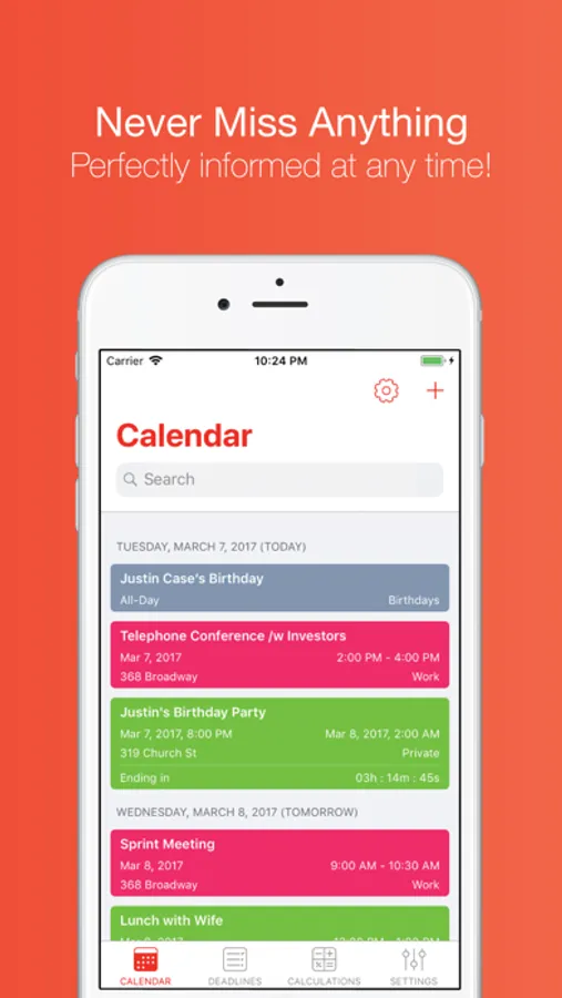 - Interact with the deadlines directly from within DayCalc (get directions, contact participants, open associated links etc.)