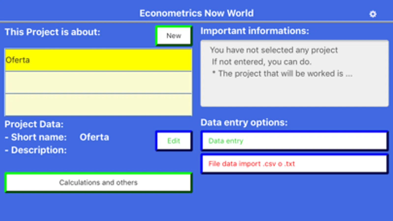 Data entry may be carried out through the use of a keyboard or by import. Data import (name of variables and data for each case) may be used provided that there is no data entered into the project, and may be done in CSV and TXT file formats. The import requires previously granted permits for information storage services. The most commonly used separators are recognized in data import; however, their change may be requested if they have not been established as commonly used separators.