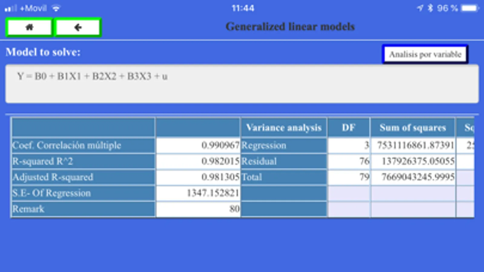 General Linear Model - Assisted by the use of green and red colors, it will allow selecting the endogenous and exogenous variable of the model, as well its remnants, if applicable. Once the calculation option has been enabled, it shall be chosen to set the model data calculation and records.