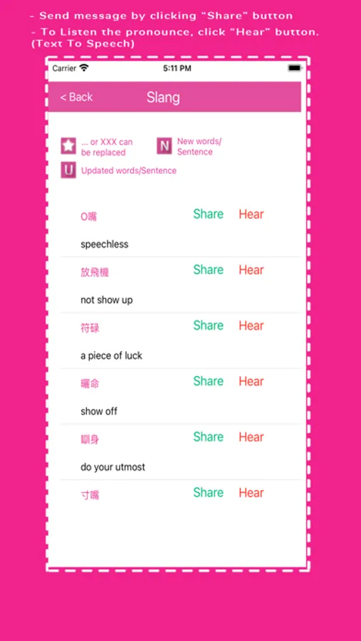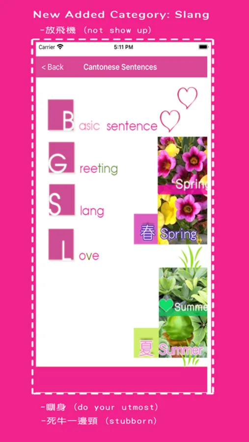 There are four categories which allow user to send messages in Cantonese such as basic sentences, greeting, slang and love.