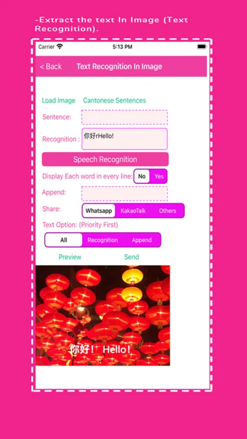 , the cantonese word/sentences can be extracted/ get from image and Speech Recognition is also added. You can send it out to friend via instant messenger.
