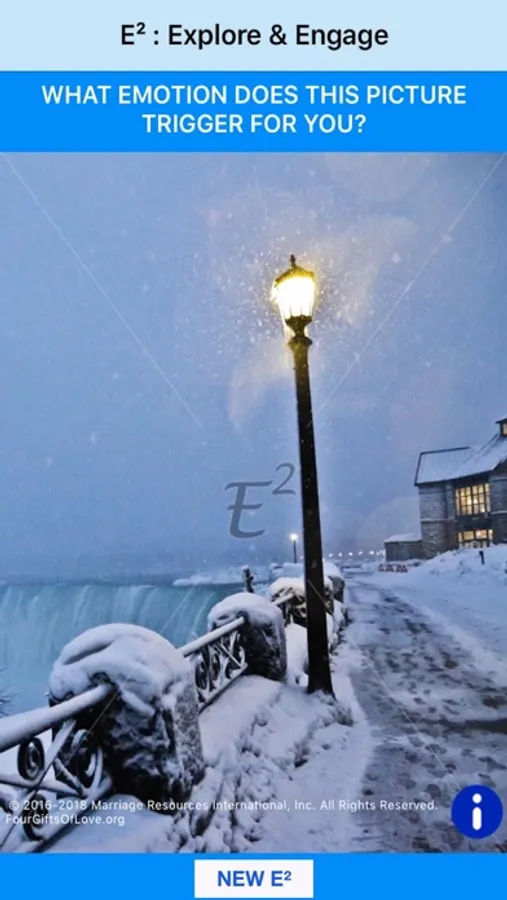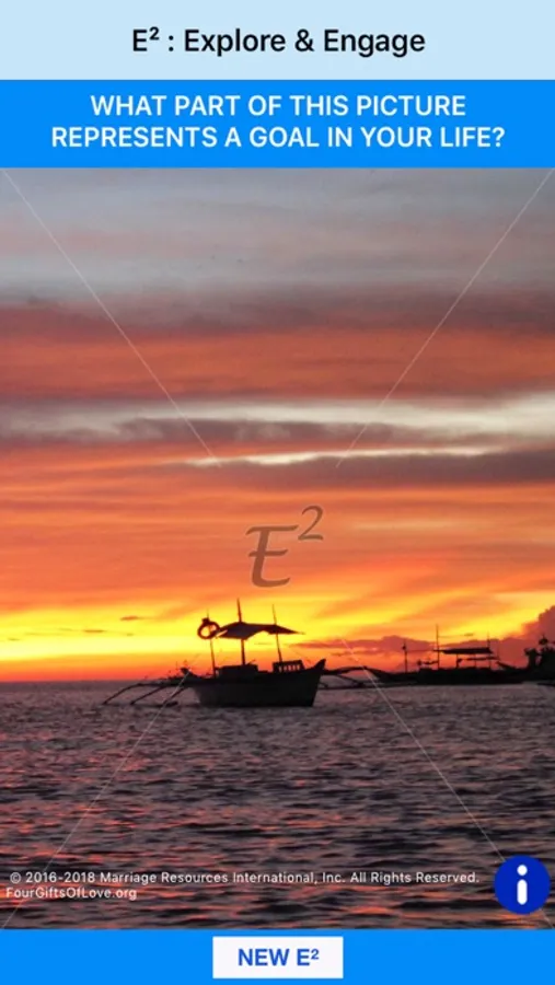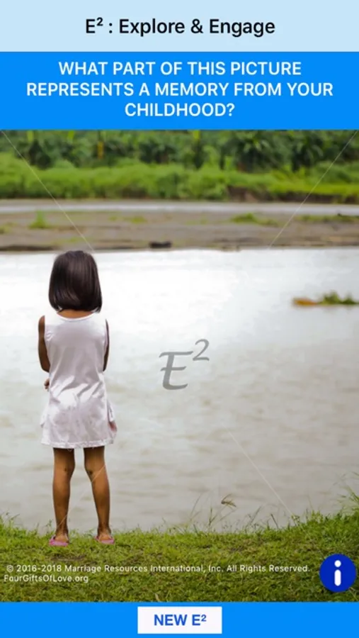 Simply look at the picture and answer the question together. If you want to use another question or picture, just click "NEW E²." It’s that simple! With fifty images and ten questions randomly generated, E² offers many opportunities to EXPLORE and ENGAGE, increasing the honesty and openness in your conversation.