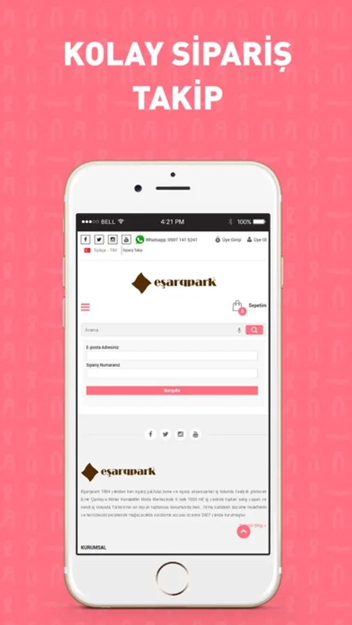 Eşarppark sadece Eşarp,Şal,Bone ve Eşarp Aksesuarları satan gerçek bir ihtisas mağazacılığı örneği ve sektöründe bir ilktir. Türkiye'nin ilk ve halen tek Eşarp mağazalar zinciridir. Geniş ürün yelpazesi ile bir anlamda eşarp hipermarketidir. Hedefimiz en kısa zamanda Anadolumuzun tüm şehirlerinde şubeleşip hanımlarımızı Eşarppark'ın güler yüzü ile buluşturmaktır. Teknolojinin gelişip hızla yayılması ve Eşarppark'ın bağımlıları tarafından sıkça dile getirilmesi nedeni ile firma 2014 yılında İnternet mağazacılığı ile de kaliteli hizmeti hanımlarımızın ayağına götürmüştür. Eşarppark Mobil uygulaması ile alışverişin Keyfine varabilirsiniz.