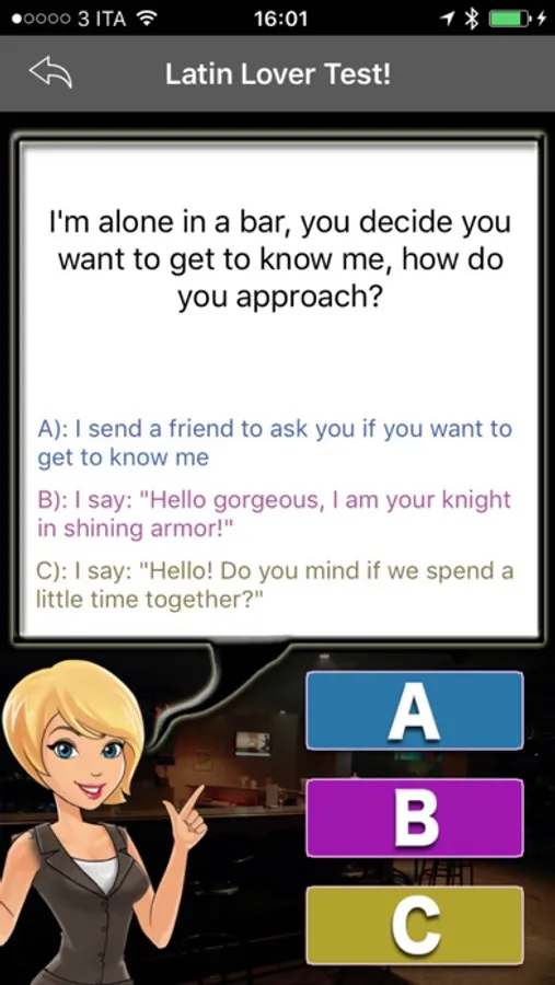 You'll have to answer a series of questions that will be made by a seductive girl and for each question you will have three different answers... but beware.... only one is the right answer... the one that will coronate you like the most sexy and charming man... in other words... a true "Latin Lover!"