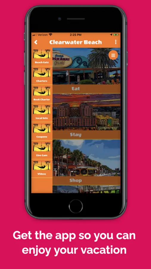 Download the Clearwater Beach app to get all your information you need on your vacation. The app is loaded with information on Restaurants, places to shop, places to play, and places to stay. Book a Charter Boat for Fishing. Order food to be delivered. Find great discount coupons. Get local information and live video feed of Clearwater Beach. Clearwater Beach located on the gulf coast near Tampa Florida and St. Petersburg Fl.