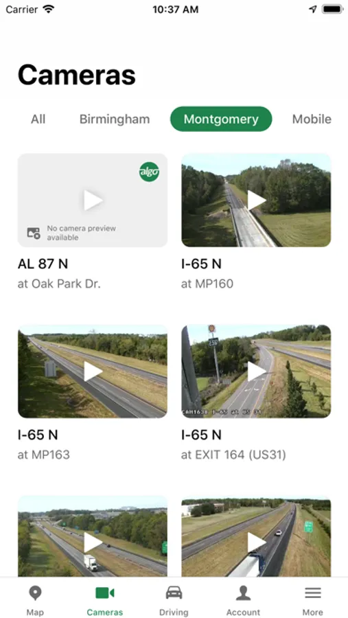 Create a profile on algotraffic.com to customize your default map settings, or check interstate traffic by viewing our live camera feeds. Learn more about active alerts for the state, or use driving mode to be notified of upcoming events on your route. Currently supporting Birmingham, Huntsville, Mobile, Montgomery, and Tuscaloosa regions.