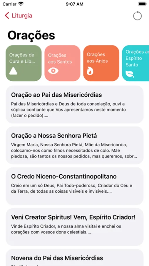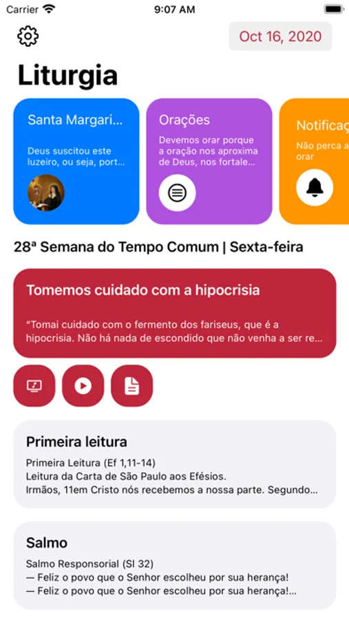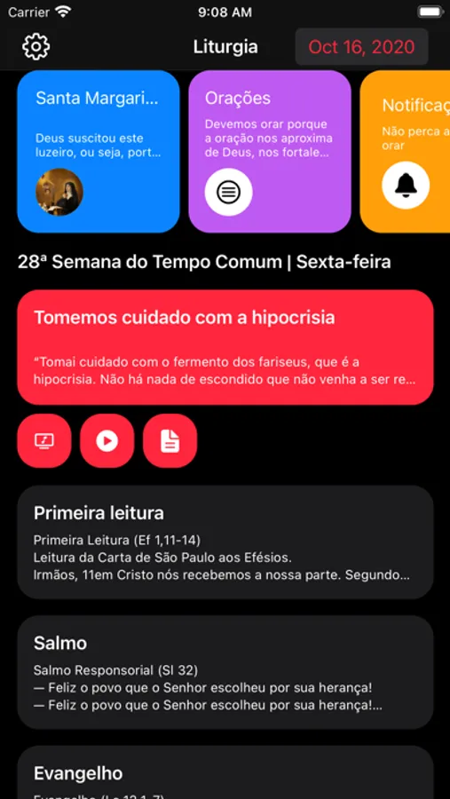 O aplicativo Liturgia apresenta a liturgia diária de uma forma simples e bonita, na palma da sua mão. Com ele, você pode acessar a liturgia de todos os dias do ano (são leituras, evangelhos, responsórios, mensagens e muito mais!), fazer diversas orações, e ainda ficar sabendo qual é o santo de cada dia.