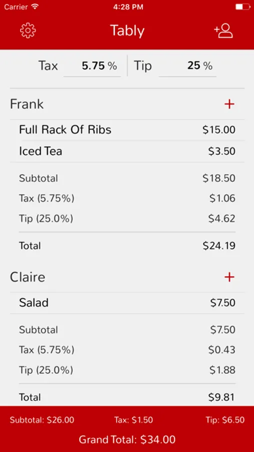 Simply add each person, assign each item to the respective person, specify the total tax and tip amount, and immediately see a breakdown of how much each person owes.