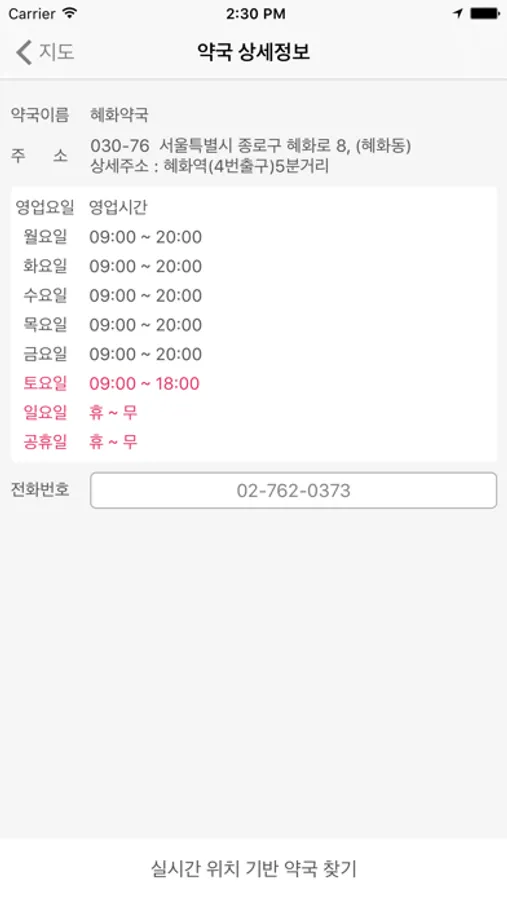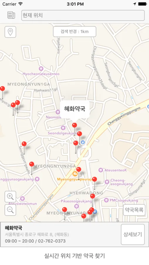 - 나의 위치를 기반으로 주위에 있는 약국의 위치 및 정보, 영업시간을 확인할 수 있습니다.