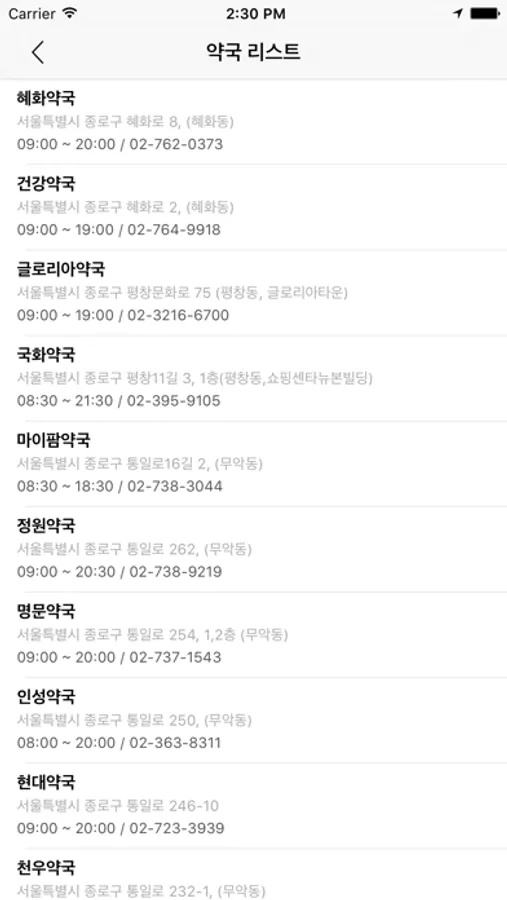 - 특정 주소를 선택하여 그 지역에 있는 모든 약국을 확인할 수 있습니다.