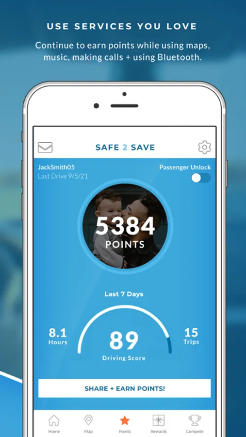 1) Open SAFE 2 SAVE each time you start driving to earn points (or activate the Auto-On feature so that it will open automatically as you drive).