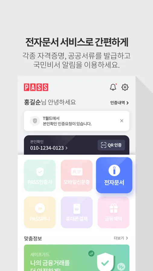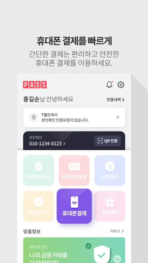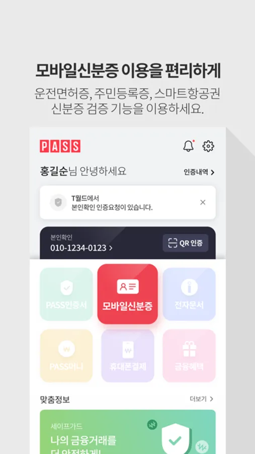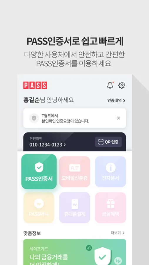 본인확인, PASS인증서, 모바일신분증 등 인증서비스와 신용, 금융, 주식, 부동산, 투자, 건강 생활 정보 및 휴대폰결제 서비스를 제공합니다.