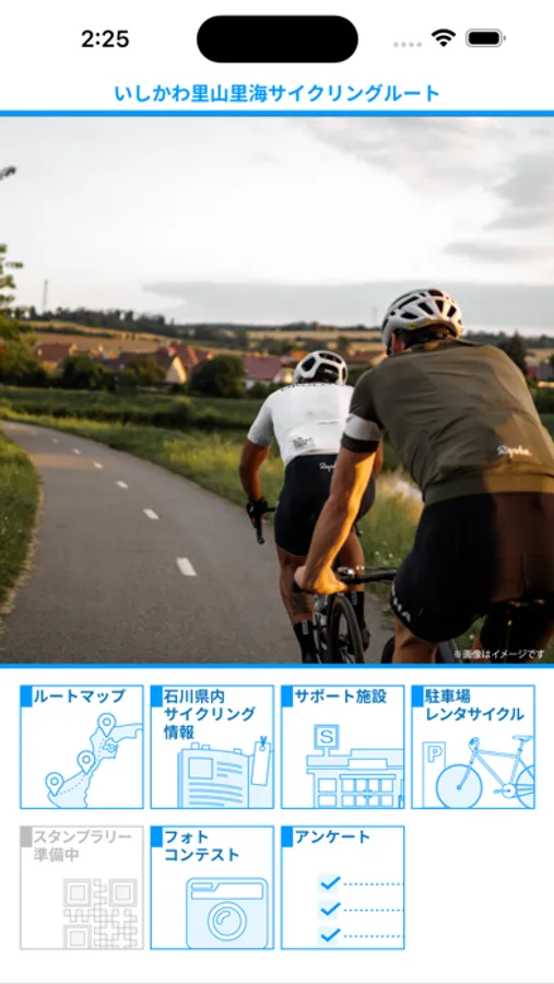 本アプリでは、利用者に安心・安全にサイクリングを楽しんでいただくために、ルートやサポート施設、駐車場・レンタサイクル情報等を案内しています。