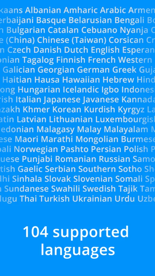 Afrikaans, Albanian, Amharic, Arabic, Armenian, Azerbaijani, Basque, Belarusian, Bengali, Bosnian, Bulgarian, Catalan, Cebuano, Chichewa, Chinese (Simplified), Chinese (Traditional), Corsican, Croatian, Czech, Dutch, English, Esperanto, Estonian, Filipino, Finnish, French, Frisian, Galician, Georgian, German, Greek, Gujarati, Haitian Creole, Hausa, Hawaiian, Hebrew, Hindi, Hmong, Hungarian, Icelandic, Igbo, Indonesian, Irish, Italian, Japanese, Javanese, Kannada, Kazakh, Khmer, Korean, Kurdish (Kurmanji), Kyrgyz, Lao, Latin, Latvian, Lithuanian, Luxembourgish, Macedonian, Malagasy, Malay, Malayalam, Maltese, Maori, Marathi, Mongolian, Myanmar (Burmese), Nepali, Norwegian, Pashto, Persian, Polish, Portuguese, Punjabi, Romanian, Russian, Samoan, Scots Gaelic, Serbian, Sesotho, Shona, Sindhi, Sinhala, Slovak, Slovenian, Somali, Spanish, Sundanese, Swahili, Swedish, Tajik, Tamil, Telugu, Thai, Turkish, Ukrainian, Urdu, Uzbek, Vietnamese, Welsh, Xhosa, Yiddish, Zulu