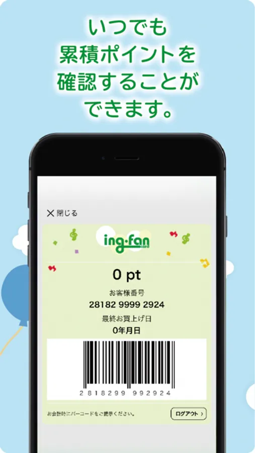 ※ing・fanVカード会員様は、バーコードの表示ができません。累積ポイントの確認のみ可能です。
