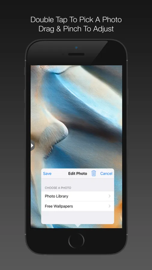 You can choose any photo from your Photo Library, or pick from the free wallpapers that come with the app. Move the photo by dragging, and resize it by pinching. Double tap the photo to choose a different photo.