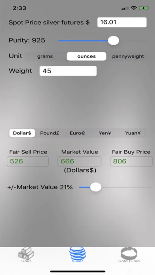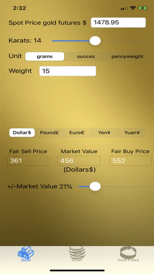 If you like the app you can purchase the ability to unlock and get the most recent price of gold in dollars per ounce and have it automatically populated in the field for your calculations. This purchase also unlocks the Karat slider and allows you to choose Karot values ranging from 6 to 24. The other in-app purchase unlocks spot silver quotes and gives you the ability to price your gold-filled and silver items.