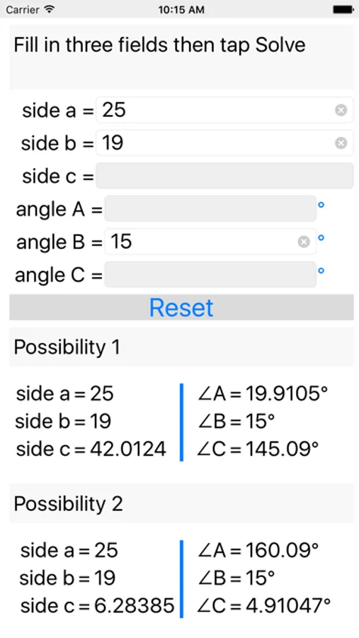 Given three measures of sides or angles of a triangle (including at least one side) this app can find and report the rest.