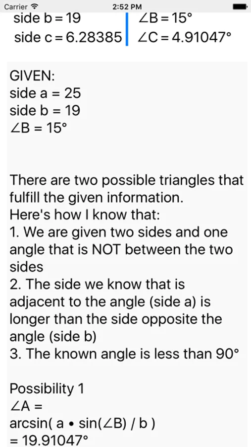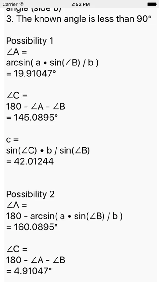 This app's most special feature is that it reports the formulae it uses so you can learn how to solve triangles yourself.