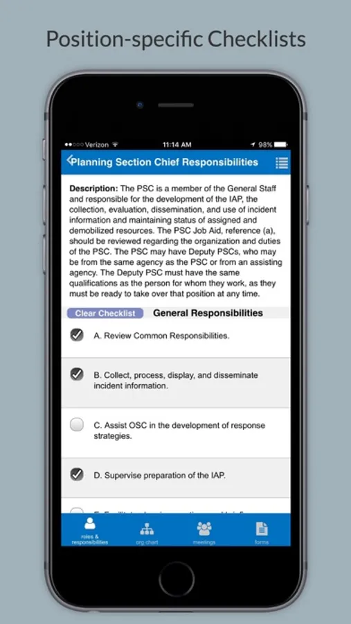 eIMH is simple to use and allows the incident management team to interact with their electronic job aides both in the command post and in the field. The intuitive interface allows the ability to conduct ICS planning cycle meetings, complete role specific checklists/tasks, and track results.