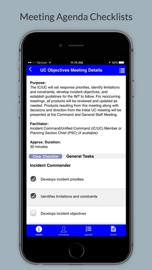 • Meeting details pages with checklists for tasks, attendees, agendas as well as a listing of ICS forms normally used during those meetings.