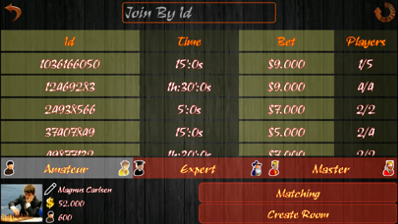 • Create room with money bet and game time and max players that you want to challenge your friends.