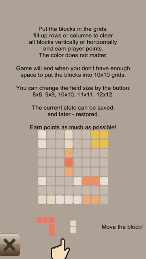 Put the blocks in the grids, fill up rows or columns to clear all blocks vertically or horizontally and earn player points.