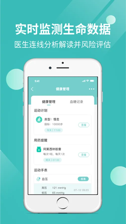 这是一款健康护理型app,可以通过实时监测血糖、血压、心电了解自身身体状况,还可以进行预约挂号,视频问诊,紧急呼叫120,医疗保险,健康体检咨询,解决患者看病难及时给予患者最优质的服务。