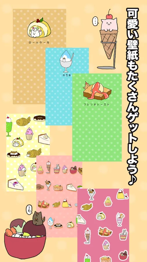 スイーツをたくさん食べるとゆるカワなねこ達の壁紙がもらえちゃう!