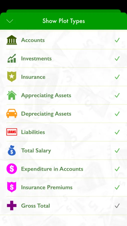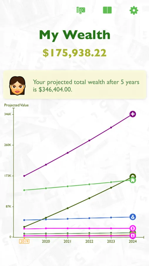 MyWealth will compute your total wealth by taking into account your income and asset values with interest rates, expected rate of returns on investments, etc. You can monitor how your wealth will grow up to the next 50 years.