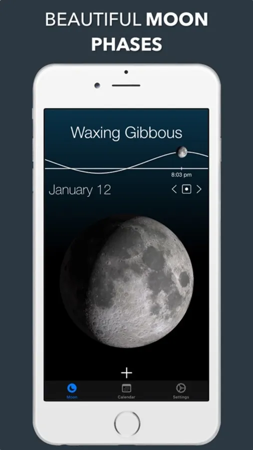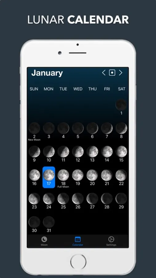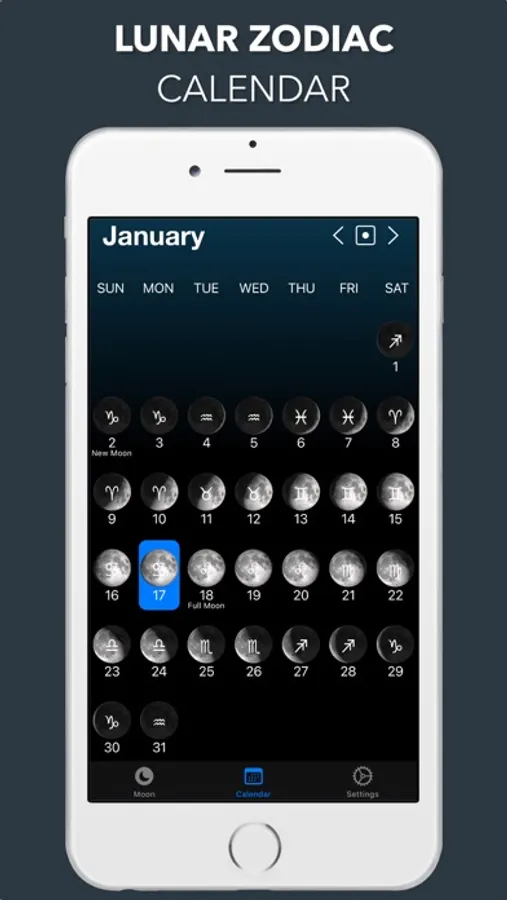 In the clean and uncluttered calendar view, you can see the moon phase for every day of the month. You can also tap any date to bring up more details for this date. The calendar can also show the Lunar Zodiac for each day.
