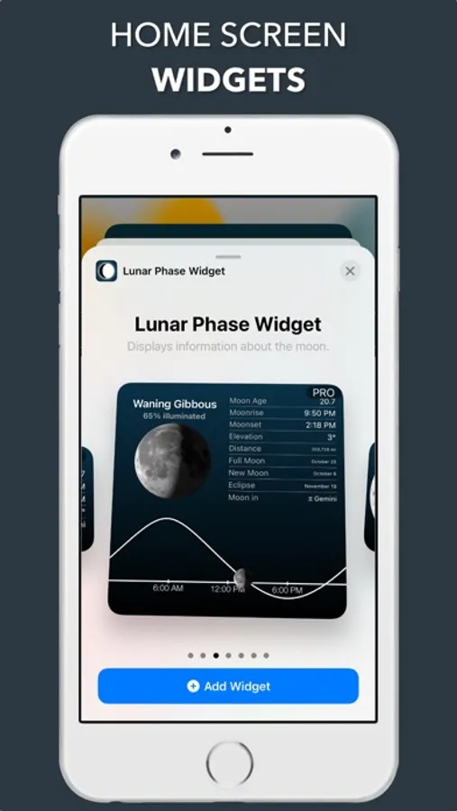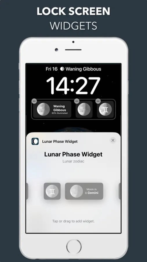 To add widgets to your home screen, long press on an empty space on your home screen and tap the + button at the top. Search the list for "Lunar Phase Widget".