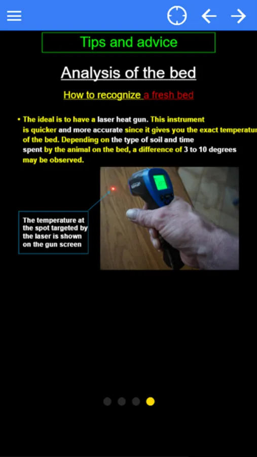 The Tracker app was designed specifically for these situations. Based on the evidence collected at the site, it will help the hunter to know the status of the animal and to adjust his behavior and research accordingly. An essential tool for the responsible hunter!