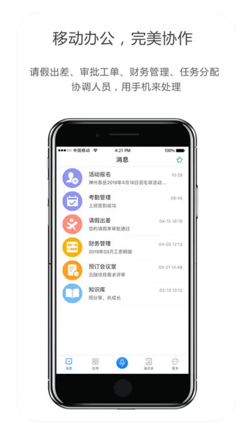 * 提供多种移动OA组件,会议室预定组件能够通过手机预定会议室,邀请相关与会人;考勤管理组件,支持按地理位置打卡,下班打卡、考勤日历、考勤排行;