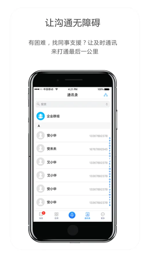 * 企业通讯录功能,支持统一维护,后台集中维护,保证了信息的及时更新;支持按人名、拼音、电话、邮箱、账号、部门等多种方式的模糊匹配查询;灵活的分级授权机制,支持不同的通讯录访问权限;优化的更新存储机制,支持2000-50万量级的通讯录