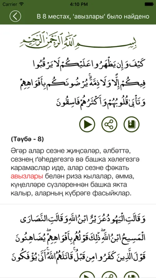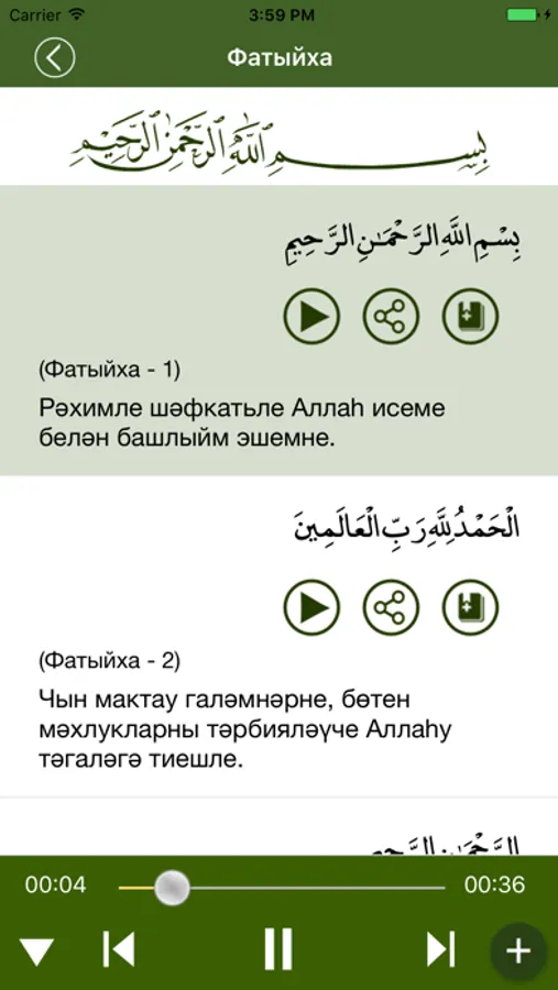 With this Islamic book app, you are getting Hafizi Коръән with real page-curl experience. This is not just a textual app, it is an audio Коръән app. You can listen telwat of Коръән verse/аят continuously (internet connection required). You can search words or topic in татарча on this iOS Korán app. Bookmark the verse/аят you like / quote. Share the verse/аят you want.
