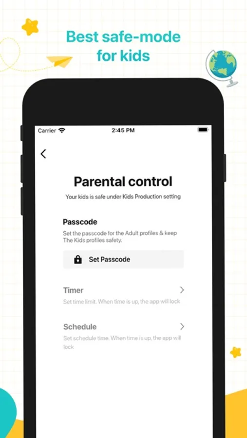 - Parental controls and security measures with passcodes to stop kids from using the entertainment app during times they aren’t supervised, provide you with simple controls over your child's usage habits.