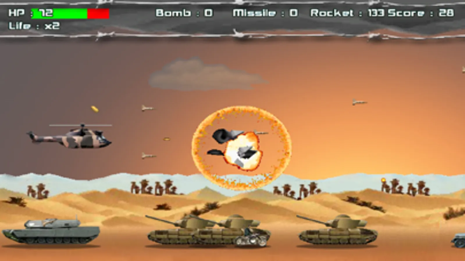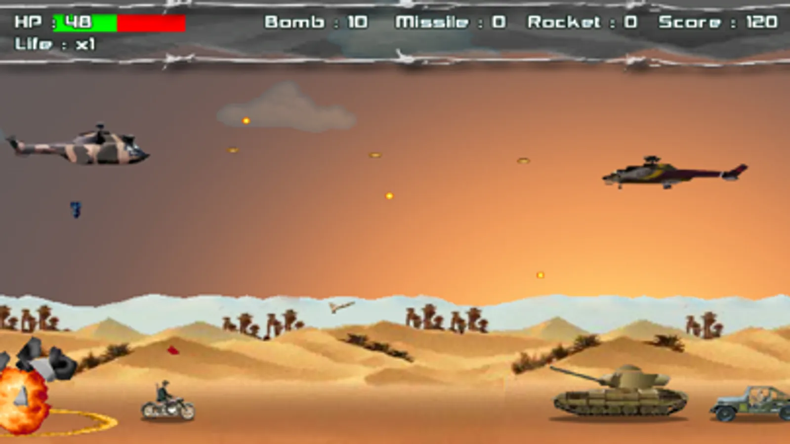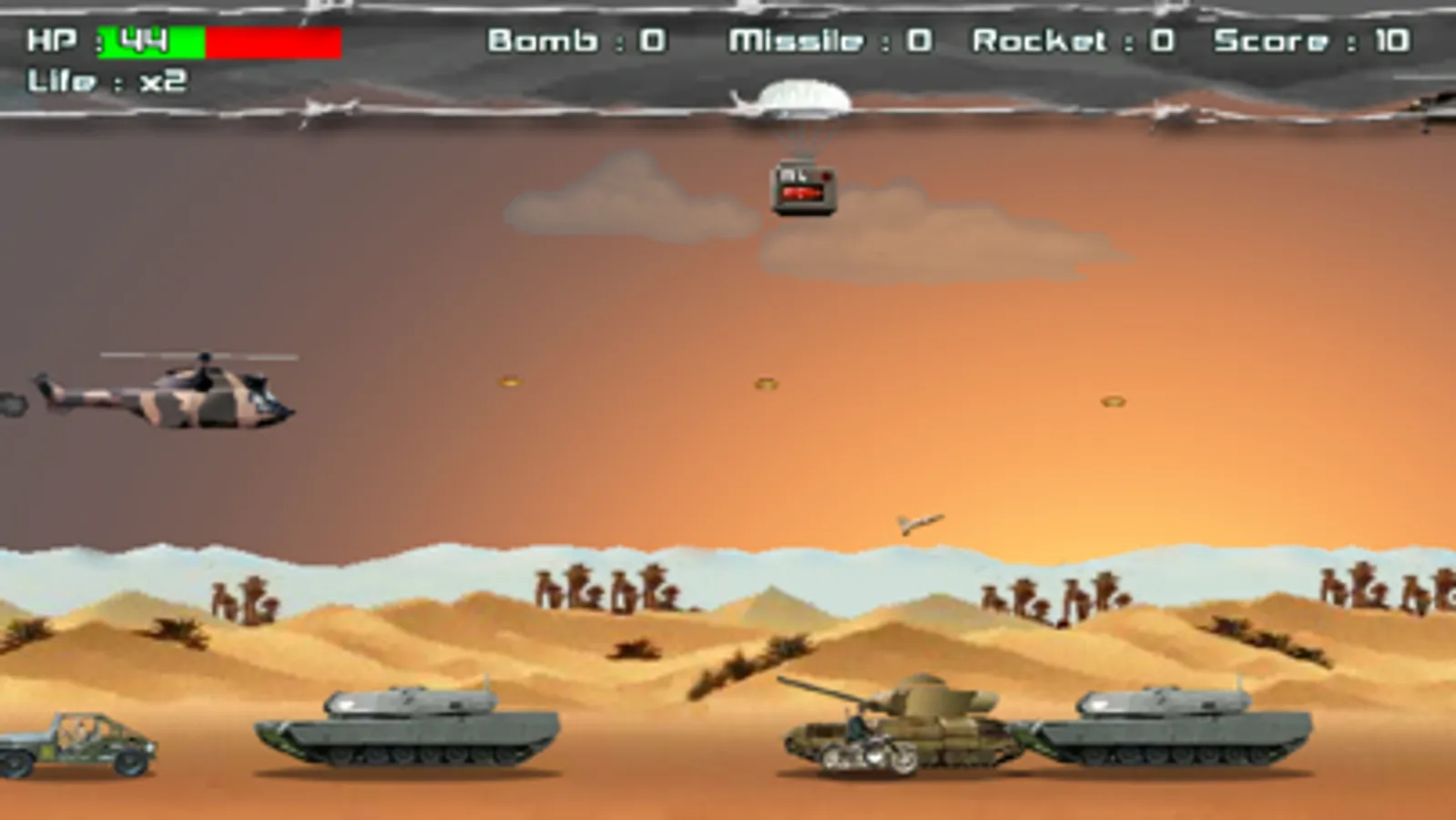 In Apache Desert War, your mission is to neutralize as many enemy units as possible. Try getting the power-ups and health boosts dropped by the parachutes, they will help you on your mission. If you get shot down, don't worry as you have a few lives and will get a brand new helicopter, but without all the bonuses you picked up on the level.