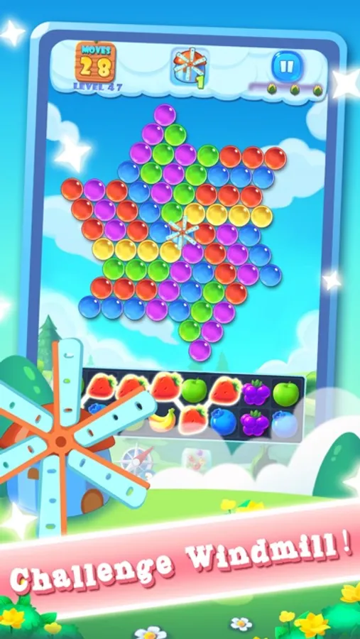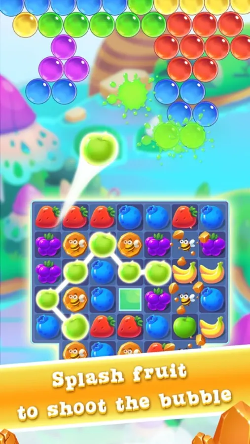 - Match 3 of the same fruit, link to splash it or shoot bubbles.