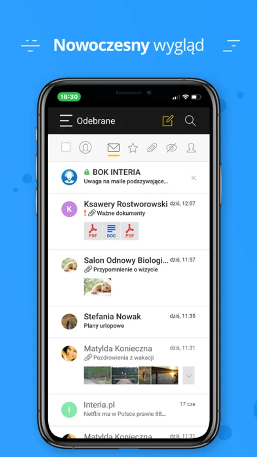 • przejrzysta lista wiadomości z podglądem załączników graficznych widocznych na pierwszy rzut oka