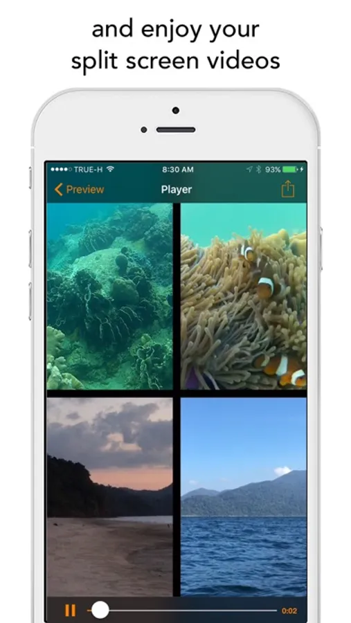 - Save your split screen videos in your camera roll, send them by email, or export them to other apps installed on your device