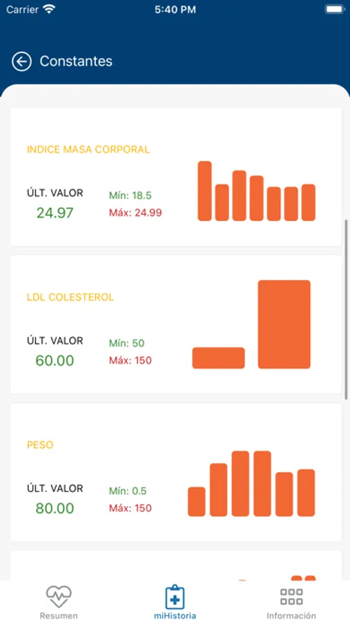 Gráfica con la evolución de los últimos valores de las principales constantes de exploración (peso, tensión arterial, etc.) y valores de laboratorio esenciales de seguimiento (colesterol, triglicéridos y otros).