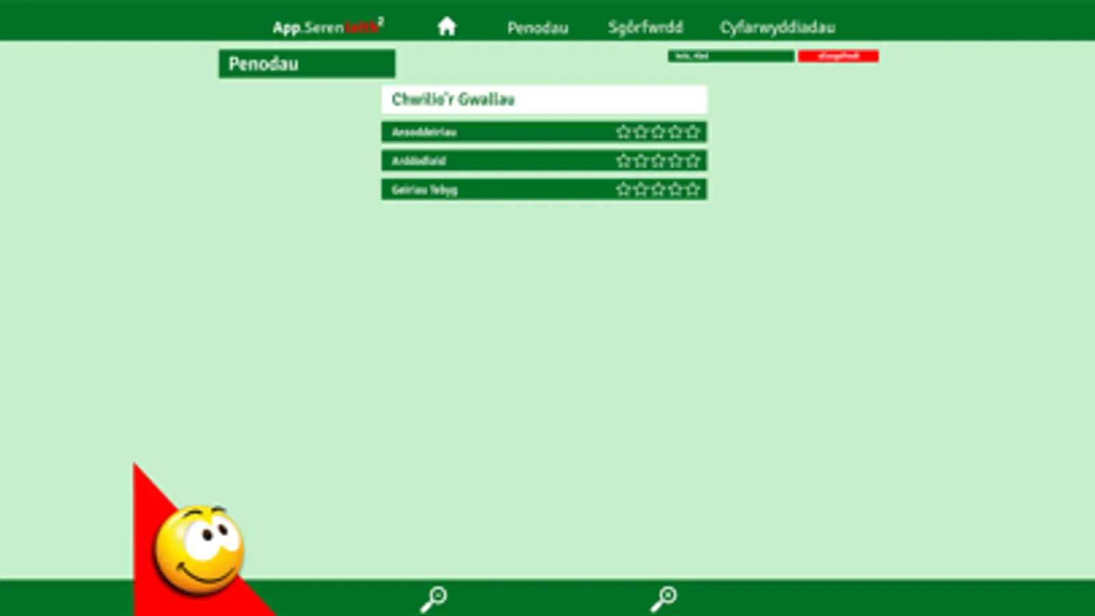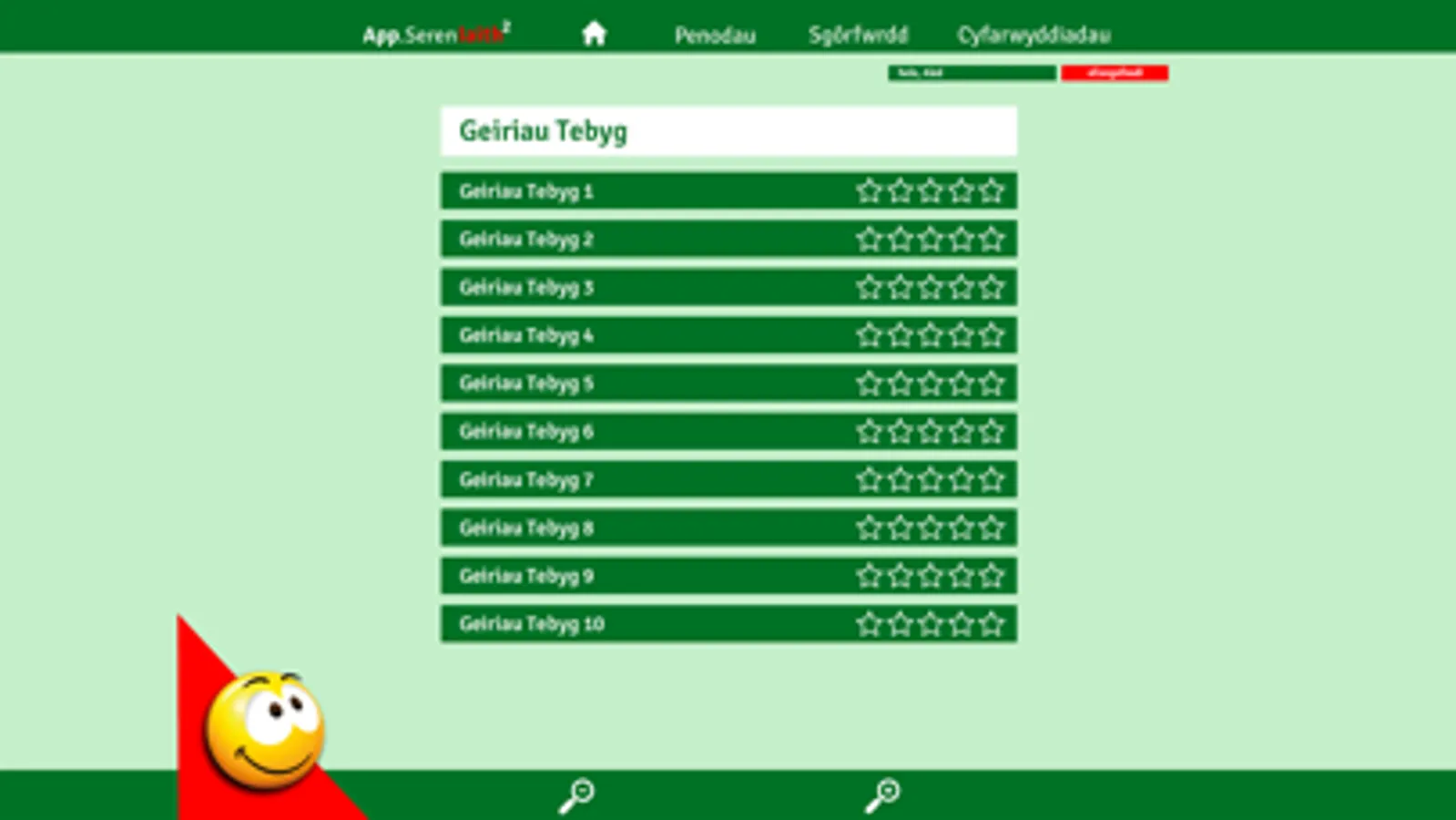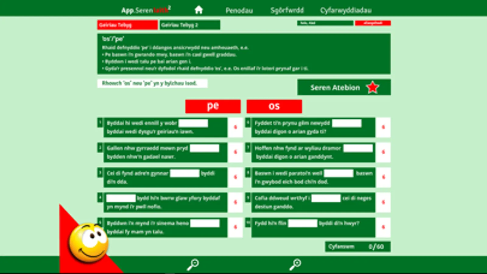 Nod yr app hwn yw gwella sgiliau ieithyddol oedolion a phobl ifanc Cymru, yn Gymry Cymraeg ac yn ddysgwyr ac unwaith eto, targedir y gwallau mwyaf cyffredin. Mae atebion posibl i bob tasg ar gael wrth ddefnyddio’r ‘seren atebion’ yn y meddalwedd.