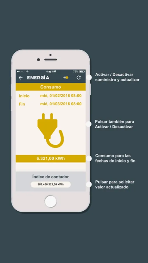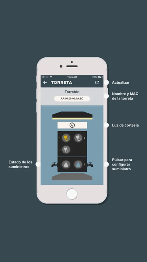 Con las credenciales adecuadas, esta aplicación permite acceder a los suministros de algunas o todas las torretas de un puerto deportivo con el Sistema HERMES. Se pueden activar o desactivar suministros de agua o electricidad individualmente, se puede leer el valor o índice del contador asociado, y se puede solicitar un cálculo del consumo de los suministros entre dos fechas. Además, permite acceder a un listado de alarmas o notificaciones importantes sobre el corte y la activación de los suministros de luz y agua conectados al barco.