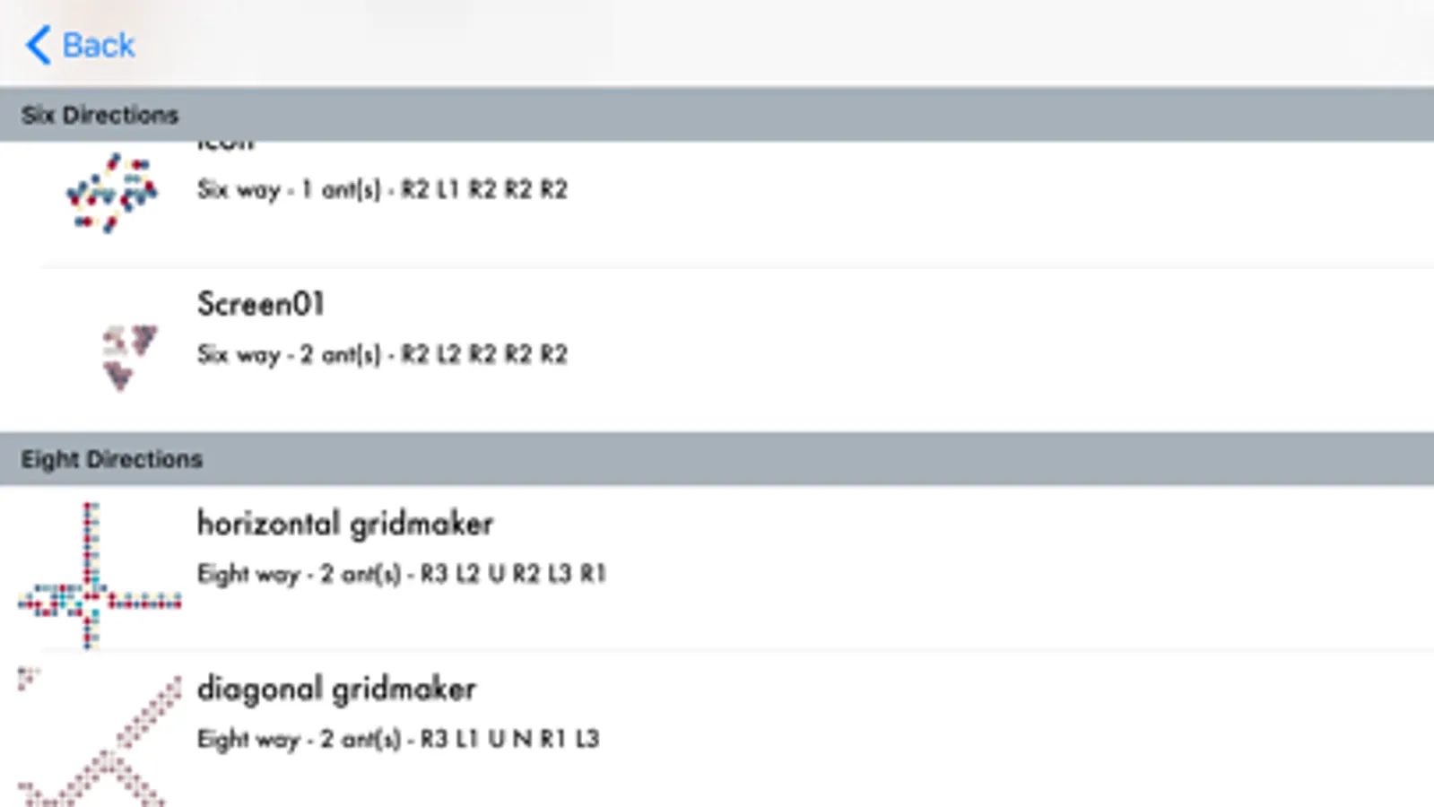 - use square and hexagonal grids (also allows ants which travel to all 8 directions in its Moore neighbourhood)