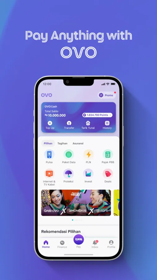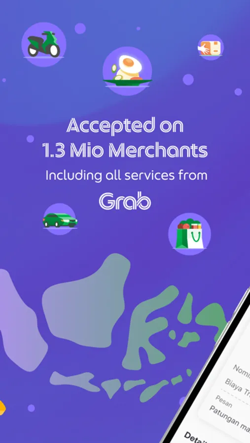 Use OVO to pay across our 500.000+ retail merchants, airtime, bills, parking, for all your services in Grab, and for all purchases in Tokopedia.