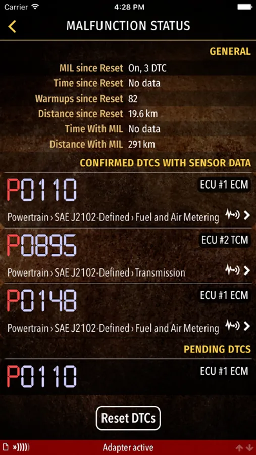 Connect an OBD2 WiFi or BLE adapter to your vehicle and select it from the app. View the current sensor data. Load the diagnostic trouble codes (DTC) and inspect the freeze frame data from when the error occured. The component monitoring can tell you about potential problems by showing contiguous and non-contiguous monitors as well as a detailed analysis of mode 6 diagnostics (if supported by your vehicle). If you can fix your vehicle yourself, reset the saved DTC.